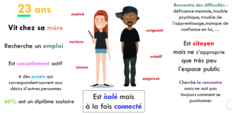 Lives with his/her mother ; Looking for a job ; 60% have a diploma ; Is isolated but also connected.